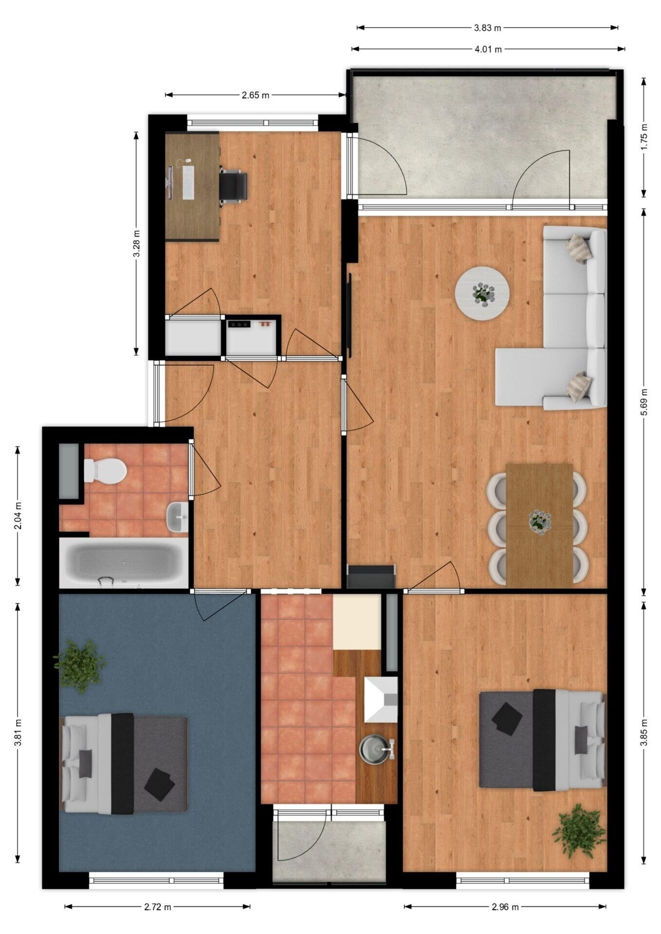 De toegang tot het appartement is te bereiken middels het trappenhuis en vindt plaats in de hal voorzien van de intercominstallatie, de garderoberuimte en de meterkast. Van hieruit toegang tot twee slaapkamers, de woonkamer, de keuken en de badkamer. Deze laatste biedt een zwevend toilet, een wastafel en een ligbad met douchegelegenheid. De keuken is voorzien van een rvs-spoelbak, een gaskookplaat met rvs afzuigkap, een combi-oven/magnetron, een koel- / vrieskast en een vaatwasser. De woonkamer is zuidgericht en beschikt over grote raampartijen welke voor veel lichtinval zorgen, vanuit de woonkamer is er directe toegang tot het balkon. Ook de eerste slaapkamer is te bereiken vanuit de woonkamer en is gelegen aan de voorzijde van het complex. De ramen zijn, net als de overige slaapkamers, uitgevoerd in kunststof. De tweede slaapkamer, bereikbaar vanuit de hal, is eveneens gelegen aan de voorzijde. De derde slaapkamer is aan de achterzijde gesitueerd en biedt toegang tot het zonnige balkon.